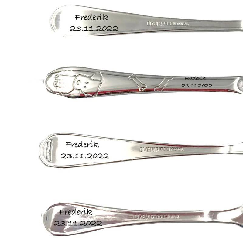 Her kan du få det sødeste bestik med motiver af kæledyr. Den søde kat, den glade hund, kaninen og marsvinet er fast motiv på forsiden. Bestikket kan indgraveres på bagsiden med din egen tekst og måske med et lille motiv efter.Teksten vil blive lasergraverede på bagsiden og teksten vil fremstå i let sort farve, som gør det let læseligt Da der er print af på begge sider af kniv, vil graveringen udføres længere oppe på skaftet Vi anbefaler alle skrifttyper til dette børnebestik og ca 25 tegn pr del. Børnebestikket er i rustfrit stål og kan tåle maskineopvask. Bestikket leveres i fin æske, så det er klar til gave.