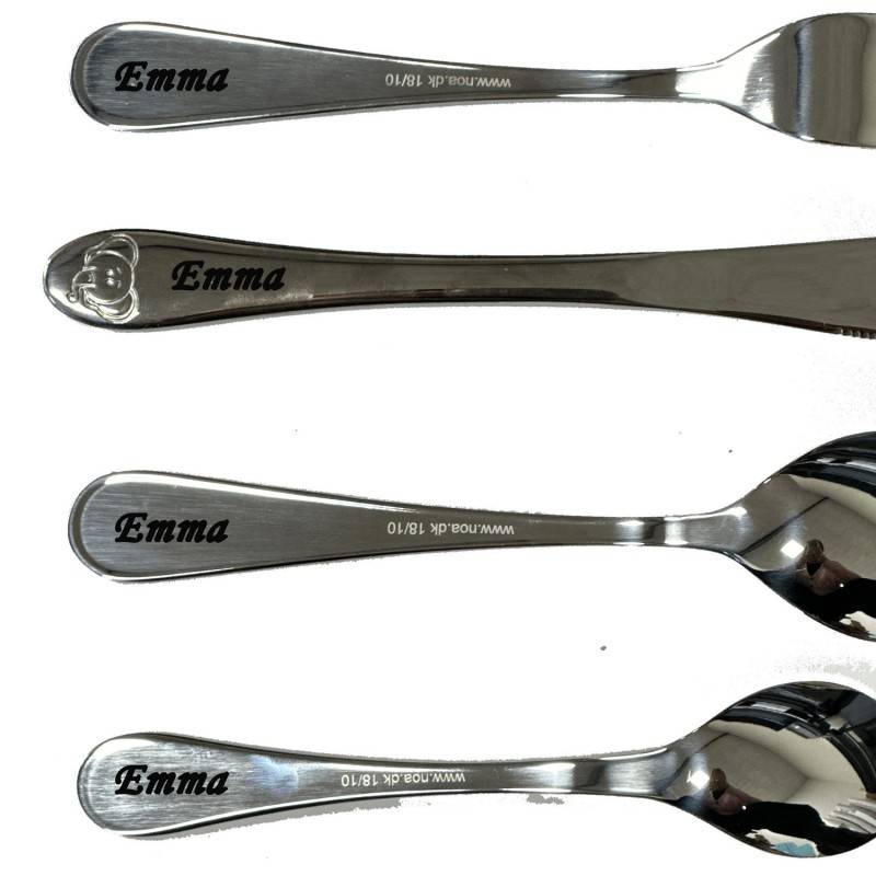 Bestikket kan lasergraveres på bagsiden med personlig tekst og eventuelt et lille motiv. Graveringen udføres i en let sort farve, som gør teksten tydelig og let læselig. Da forsiden af kniven allerede har motiver, placeres graveringen længere oppe på skaftet. Tekstlængden anbefales til maks. 25 tegn pr. del, og alle skrifttyper kan anvendes. Børnebestik er trykt bagpå med leverandørlogo i følge dansk lovgivning.