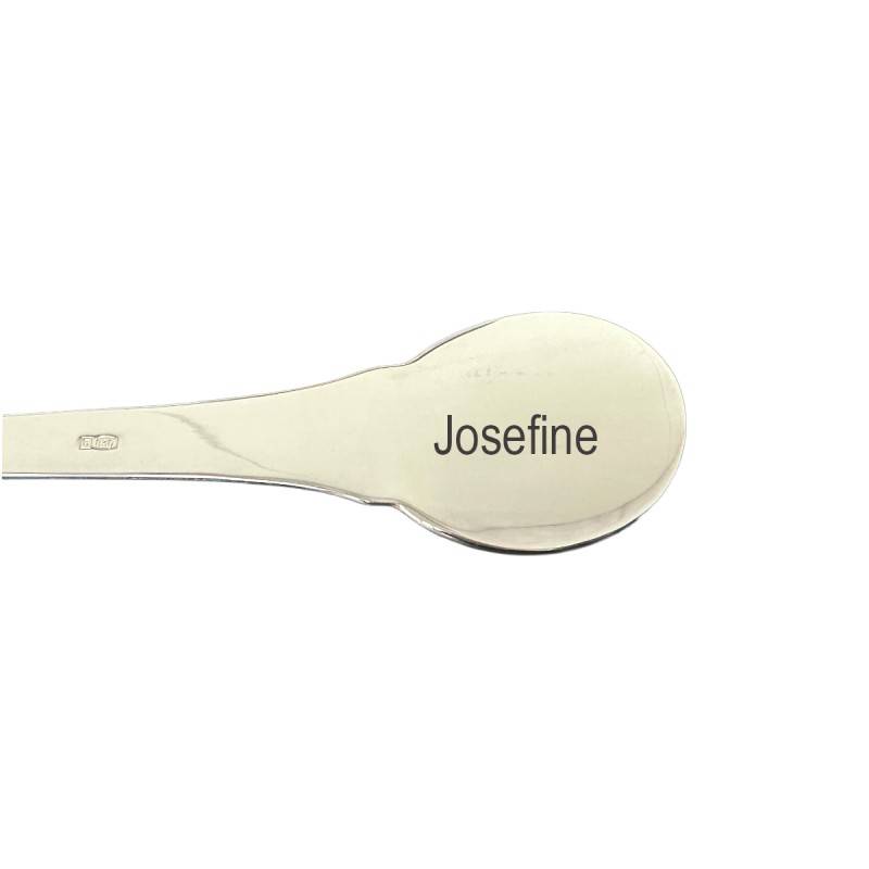 Flot og enkelt sølvske med motiv af Fyrtøjet i enden. Sølvskeen kan lasergraveres med din egen personlige tekst som feks navn og dato på barnet. Til dåb vil man skrive dåbsdatoen på skeen. Teksten vil fremstå i let sort farve og her kan alle vores skrifttyper anvendes. Ved valg af motiv - er det et motiv der vil komme efter din tekst bagpå. Graveringen vil komme på bagsiden på den lange led. En flot ske til den lille ny, som vil følge hele livet. Skeen vil leveres i æske, så man kan opbevare den når man ikke bruger den.