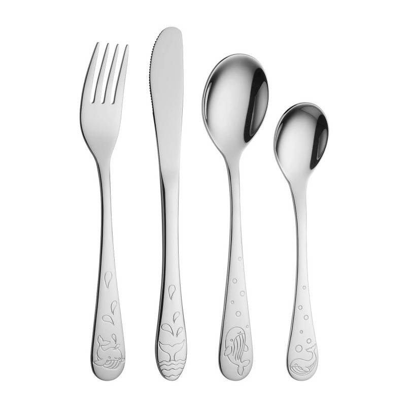 Børnebestik med hval tegning – 4 dele (Rustfrit stål + hval )