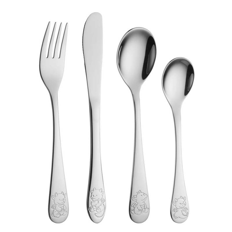 Børnebestik med drage tegning – 4 dele (Rustfrit stål + hval )