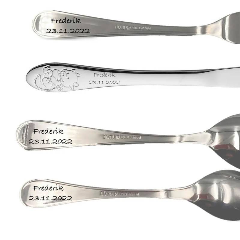 Det sødeste børnebestik med en glad lille drage på hver del. Sættet består af kniv, gaffel, spiseske og teske – fremstillet i rustfrit stål, så det både er holdbart og nemt at rengøre. Bestikket kan lasergraveres på bagsiden med din personlige tekst. Graveringen fremstår i let sort farve og gør sættet til en helt unik og mindeværdig gave.