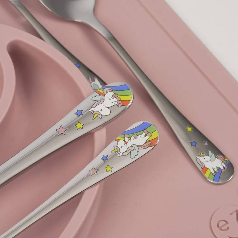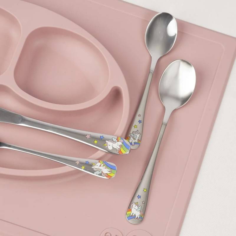 Gør måltiderne ekstra sjove og personlige med dette eventyrlige børnebestik med enhjørninge-tema. Sættet indeholder en gaffel, kniv, spiseske og teske, alle dekoreret med flotte emaljemotiver af søde enhjørninger, regnbuer og magiske detaljer. De fine og farverige motiver gør bestikket ekstra spændende og fantasifuldt ved hvert måltid.