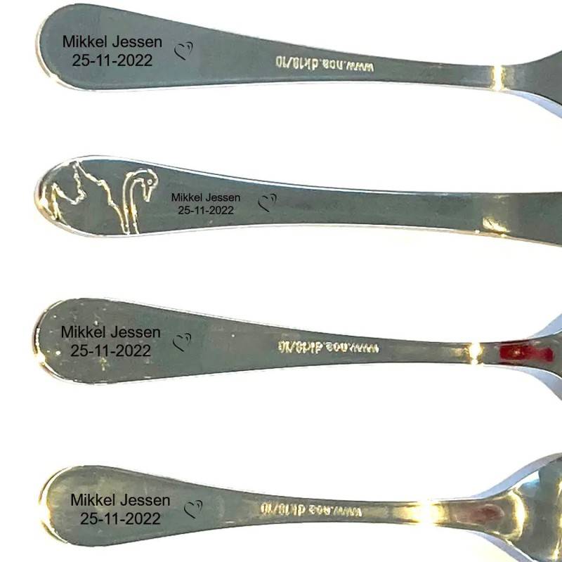 Bestikket kan lasergraveres på bagsiden med din personlige tekst, som vil fremstå i en let sort farve. Til dåb vælges der ofte navn og dåbsdato – en smuk og varig måde at mindes en stor dag.