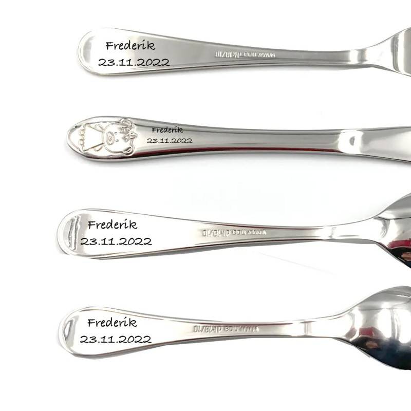 Gør måltiderne ekstra hyggelige med dette søde og blankpolerede børnebestik prydet med små Teddy bamser. Bestikket kan personliggøres på bagsiden med lasergravering – perfekt til at skabe et helt unikt og mindeværdigt sæt. Graveringen fremstår i en let sort farve og kan tilpasses med alle vores skrifttyper (maks. 25 tegn pr. del). Ønskes et lille motiv, kan dette nemt tilføjes for at gøre gaven endnu mere personlig.