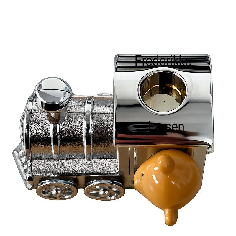Få det personlig gjort med en gravering på taget af toget. Her kan der stå et navn og en dato. Teksten bliver brændt ned i materialet og vil fremstå i let sort farve og her kan alle vores skrifttyper anvendes. Vi anbefaler max 15 tegn pr linje.