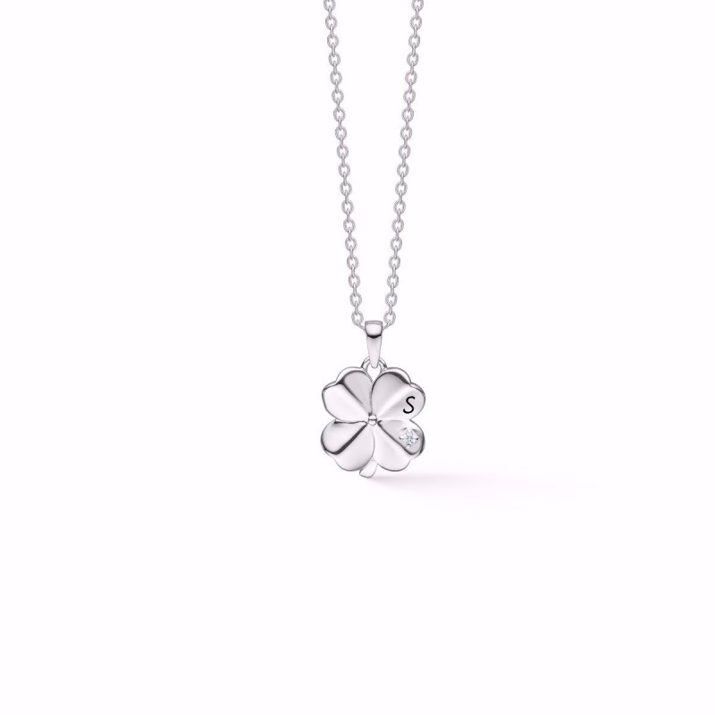 Smukt sølvvedhæng formet som et firkløver – et klassisk symbol på held og kærlighed. I midten sidder en lille klar zirkon, som giver et elegant og feminint udtryk. Vedhænget som er ca 12 mm leveres med en 45 cm sølvkæde og kan graveres med ét bogstav på hvert af kløverets fire blade. Graveringen udføres med laser og vil fremstå i en let sort farve for tydelig og flot læsbarhed. Vi anbefaler skrifttypen Arial for det mest elegante og rene udtryk. Leveres i en smuk gaveæske – klar til at give i gave.
