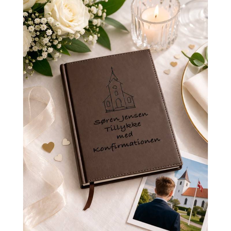 Forsiden kan personliggøres med din egen tekst. Vi lasergraverer direkte ned i materialet, hvor teksten brændes ned i kunstlæderet og fremstår i en flot, naturlig brun nuance. Resultatet er både elegant og holdbart.
