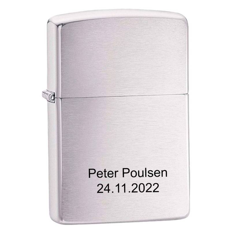 Lighteren kan indgraveres på forsiden med navn, dato, en personlig tekst – under motiv af traktor . Vi anbefaler skrifttyperne Arial eller Cosivia, som står flot på chrom-overfladen. Graveringen fremstår tydelig og stilren.