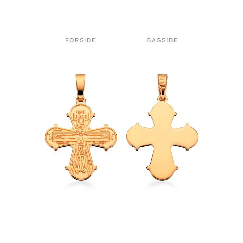 Bagsiden af korset kan lasergraveres med din egen personlige tekst, såsom et navn, initialer eller en dato. Graveringen placeres vandret på korset og kan bestå af op til 15 tegn fordelt på to linjer. Teksten fremstår i en elegant, let sort farve, som skaber en flot kontrast til den blanke guldoverflade. Den præcise lasergravering sikrer et tydeligt og holdbart resultat, der gør smykket endnu mere personligt.