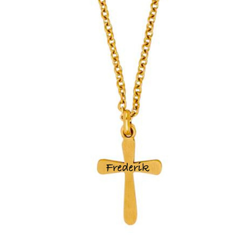 Korset måler 16 x 20 mm og har en diskret og harmonisk størrelse, som gør det velegnet til daglig brug. På forsiden af korset kan der lasergraveres en personlig tekst på tværs, såsom et navn, initialer eller en særlig dato. Graveringen udføres med høj præcision og fremstår flot og tydeligt på den blanke forgyldte overflade. Vi anbefaler skrifttypen Arial, da den giver det mest stilrene og læsbare resultat.
