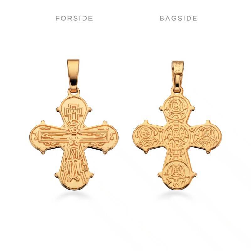 Dagmarkors forgyldt sølv Et smukt og klassisk Dagmarkors i 8 karat guld med motiv af Jesus på korset på forsiden og motiv på bagsiden – . Korset måler 17 x 18 mm og leveres med en elegant 42 cm forgyldt kæde i smykkeæske.