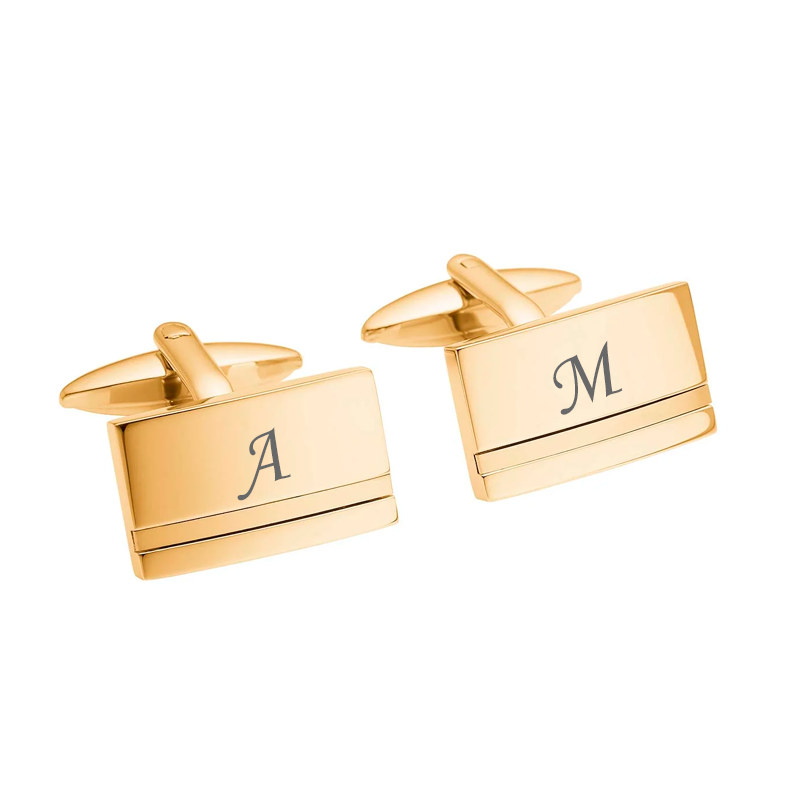 Manchetknapperne er fremstillet i forgyldt rustfrit stål, hvilket sikrer både holdbarhed og et elegant finish. Der er mulighed for personlig gravering, hvor du eksempelvis kan få indgraveret forbogstaver fra for- og efternavn, så manchetknapperne bliver helt unikke. De måler ca 20 x 12 mm og vi anbefaler ca 10 tegn pr manchetknap