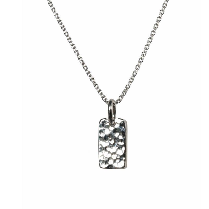 Denne stilrene sølvhalskæde har et elegant, rektangulært vedhæng med en let hamret overflade, som giver et smukt spil i lyset og et moderne udtryk. Det minimalistiske design gør smykket velegnet til både hverdag og fest – alene eller lag-på-lag med andre kæder.