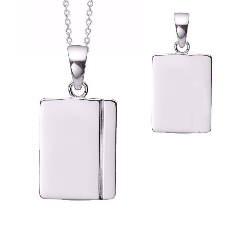 Smukt og elegant vedhæng i 925 sterling sølv. Den rektangulære plade måler 1,5 x 2 cm og har en fin graverede plade på forsiden, som giver et eksklusivt og personlig udtryk. På bagsiden er pladen blankpoleret, så den fremstår glat, skinnende og behagelig mod huden.