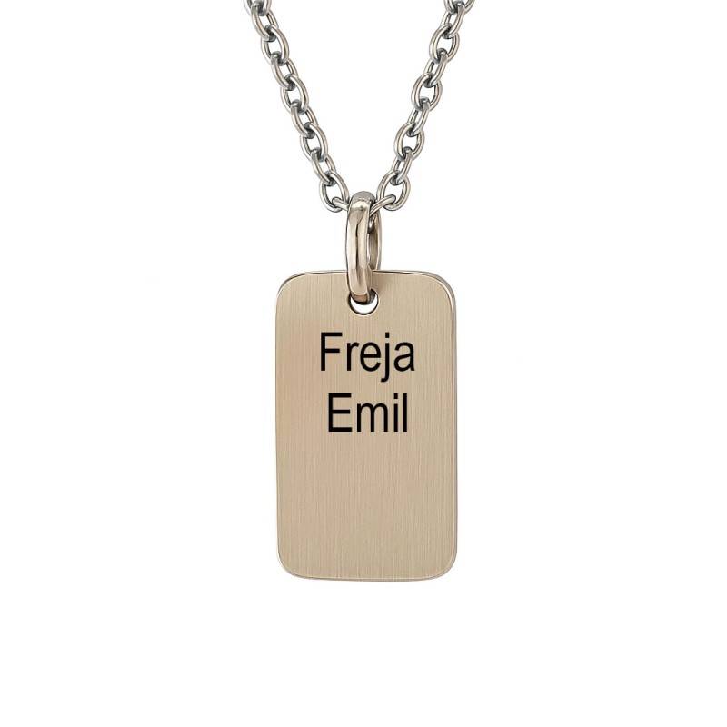 ID-taggen kan indgraveres med navn, dato, initialer eller en kort besked og gør smykket helt personligt. Graveringen udføres med laser og vil fremstå i let mørk farve for et tydeligt og flot resultat.