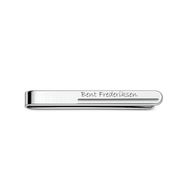 På forsiden kan slipsenålen lasergraveres med din egen personlige tekst. Der er plads til op til ca. 15 tegn, hvilket gør den ideel til initialer, et navn eller en kort dato. Graveringen udføres med laser og vil fremstå i en let sort farve, som giver et flot og diskret resultat. Vi anbefaler skrifttypen Arial for et klassisk og tydeligt udtryk.