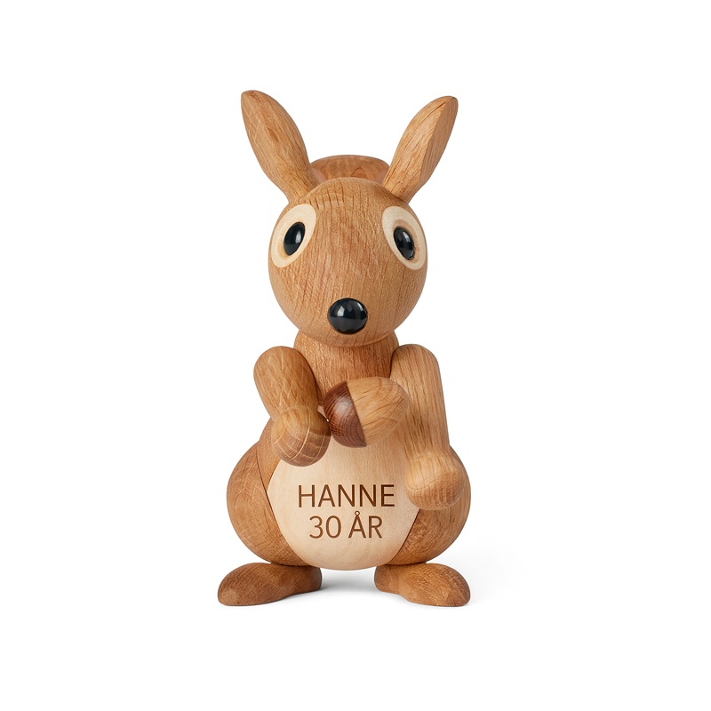 På maven kan du få en personlig gravering – op til ca. 20 tegn fordelt på 2 linjer – og gøre figuren til en helt unik gave. Teksten vil blive lasergraverede og fremstå i let sort farve. Her kan mange af vores skrifttyper anvendes.